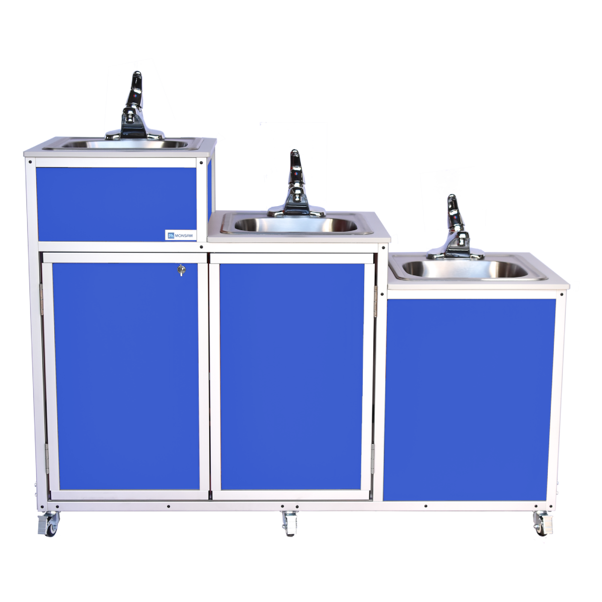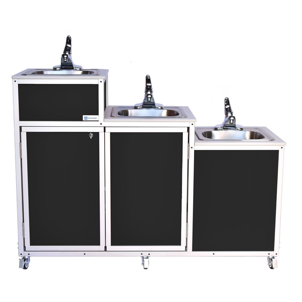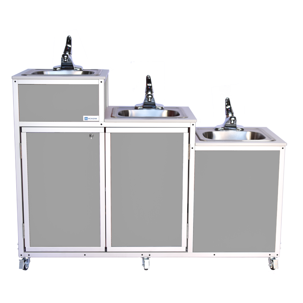 Monsam NS-009 NSF Portable Sink 39" H with 10" Deep Basin Our NS-009 portable sink model by Monsam is lightweight and mobile and comes with an extra deep 10" basin. Use this self contained sink indoors or outdoors, just wheel it out to where it is needed. Dual hot and cold water taps connected to an easy to operate adjustable heater ensure you h...