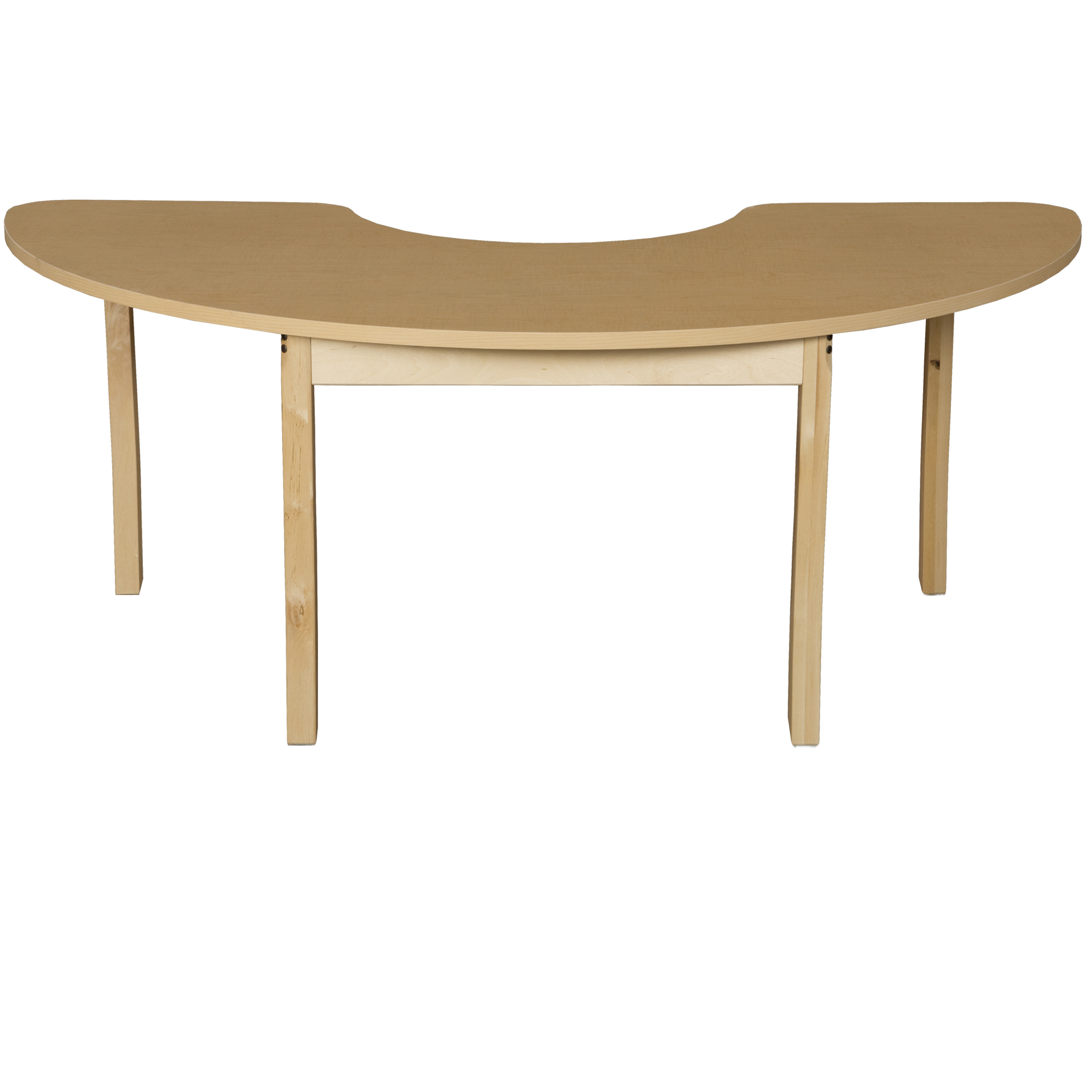GREENGUARD Gold certified. This durable 76″ x 24″ half circle activity table is made from 1″ thick MDF core with high pressure laminate and matching 3mm PVC maple grain heat-sealed edge banding. Impact resistant, preventing heavy hands from leaving indentations. Carefully rounded corners and edges for added safety. Reinforced extra strong aprons for the strongest construction possible.