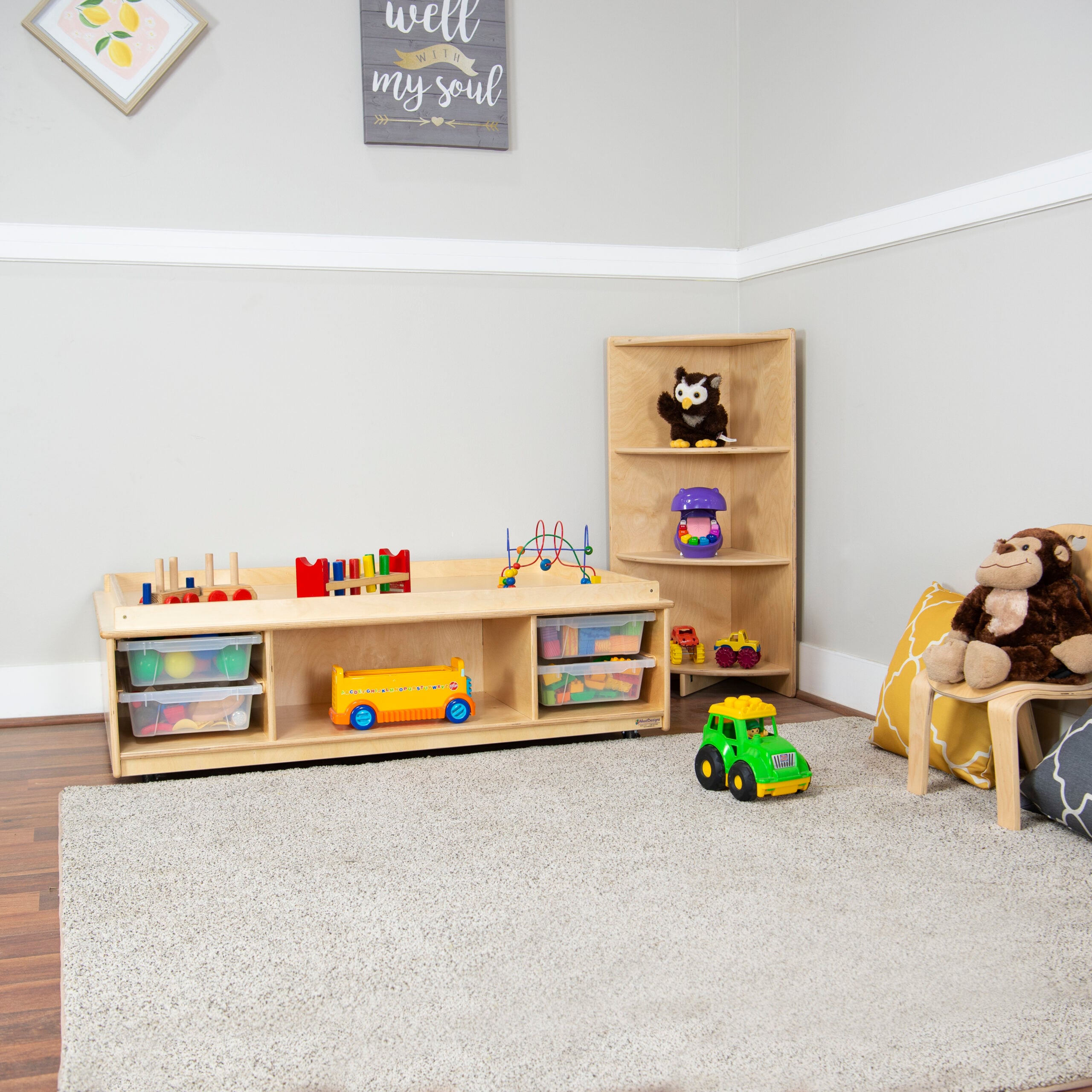 This beautiful and functional corner cabinet is perfect for extra classroom storage. Constructed from Birch Plywood, and coated with our exclusive Tuff-Gloss™ UV finish. Fully rounded corners and edges for maximum safety.