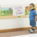 Display pictures to stimulate baby’s curiosity. Designed so clear acrylic panel lifts easily for removal of pictures and cleaning of Write-n-Wipe surface. Birch plywood frame.