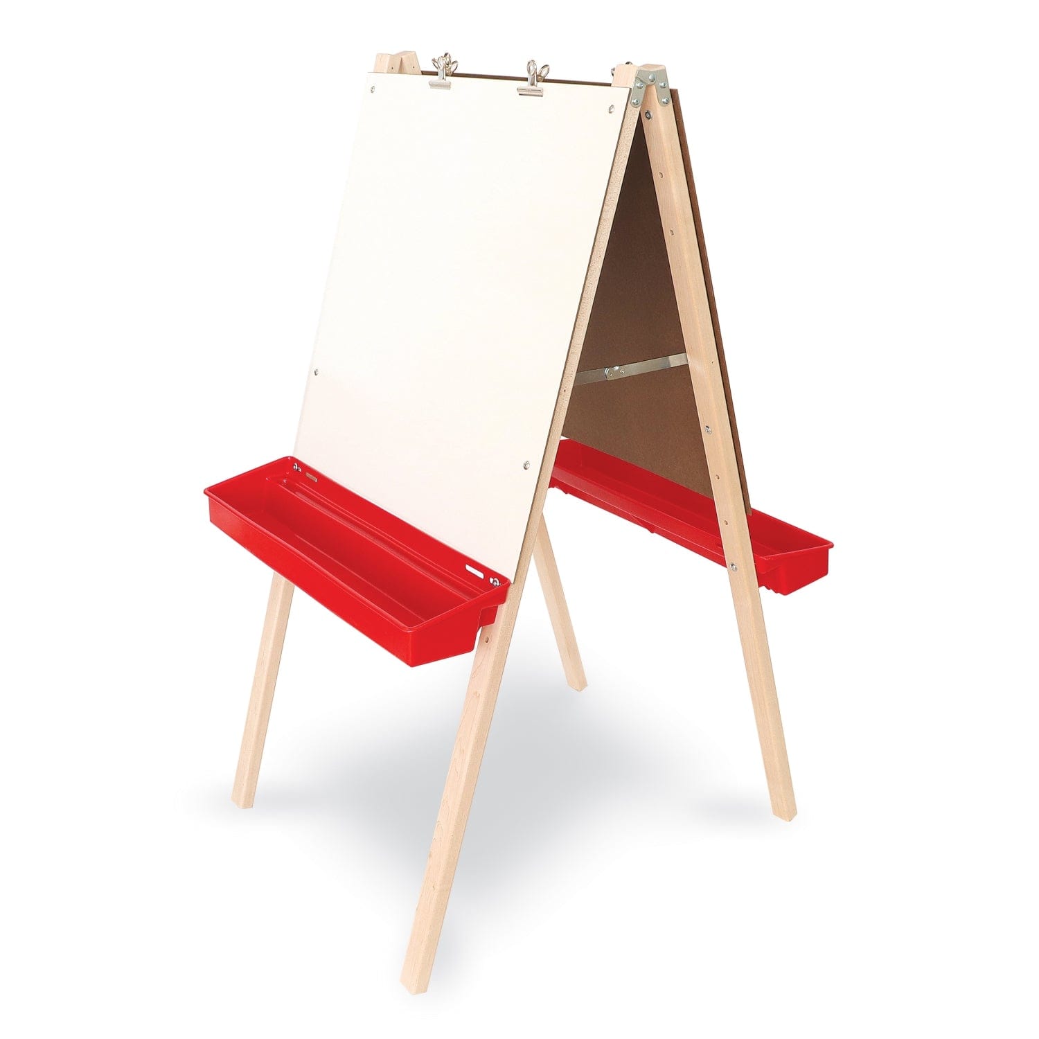 Top 50 Best Seller! Our popular and economical double-sided easel features heavy duty hinges on sturdy solid maple legs, two clips on each side that hold paper firmly, and adjustable height for children ages three and up. Includes an erasable markerboard on both sides.