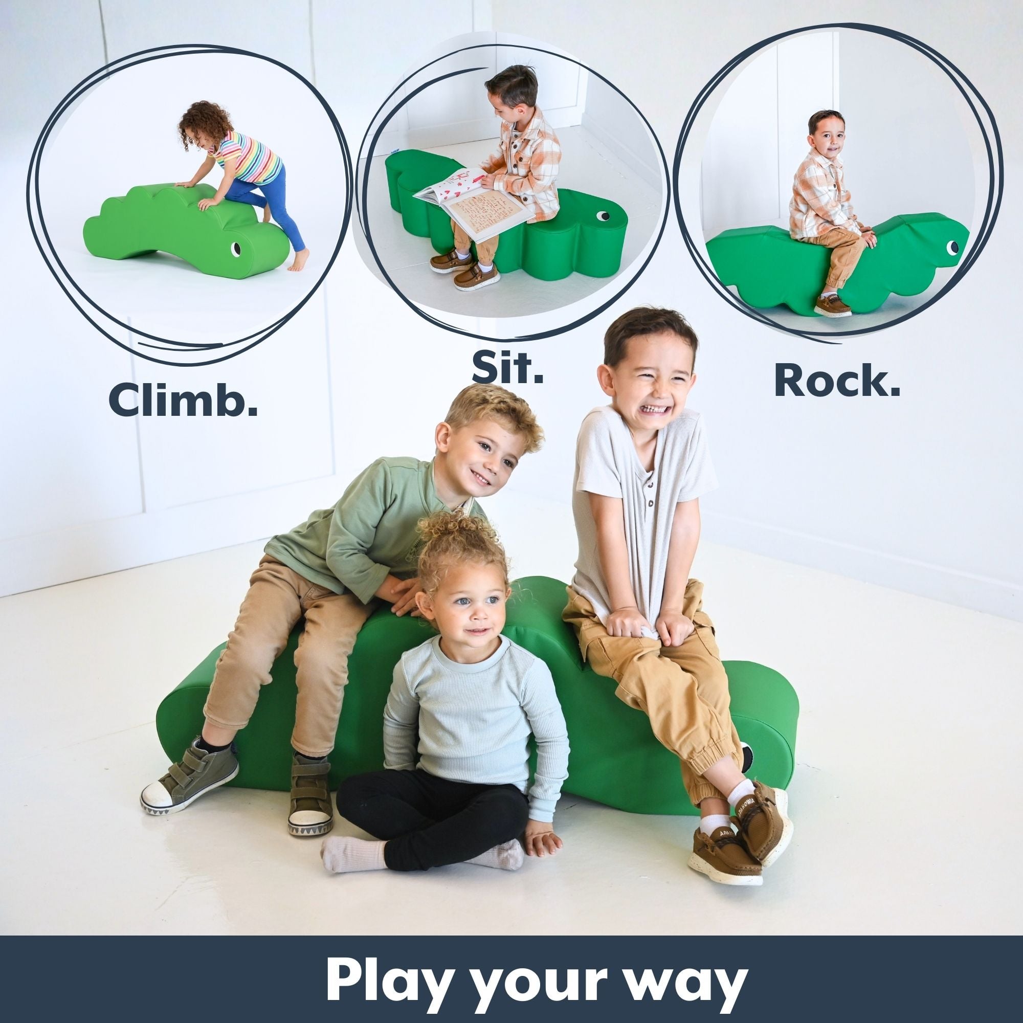 A playful caterpillar-shaped foam toddler chair offering three ways to play – climbing, sitting, or rocking – made from dense foam with water-resistant vegan leather for ages 1 to 3.