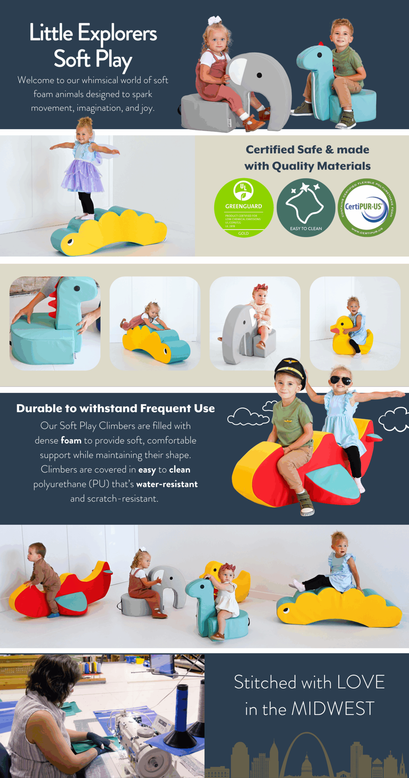 Foam toddler chair combines durability, safety, and creativity to support active early learners. Its dense foam core and water-resistant vegan leather cover not only make it long-lasting but also simplify cleanup, giving teachers and parents more time to focus on children instead of maintenance. Designed with safety in mind, the chair meets ASTM and CPSIA standards and is Prop 65 compliant, ensuring peace of mind in busy classrooms and daycare centers. The playful caterpillar design offers three ways to play. Upright for climbing, on its side as a preschool chair, or upside down as a rocker. Sized just right for ages 1–3, it is a reliable piece of preschool furniture that adapts to both learning and play. Proudly manufactured in the midwest and backed by a 2-year warranty, this toddler chair is a versatile piece of soft play furniture designed to grow with children’s curiosity.