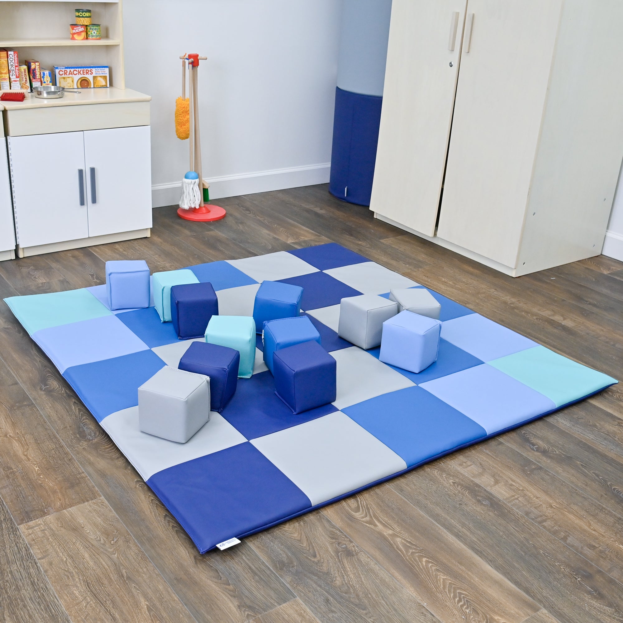 The variety of block shapes and the patchwork pattern of the mat spark imagination and are excellent for teaching colors and coordination. Ideal for both solo and group play, this set is a must-have for any playroom or daycare.