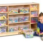 It features three center shelves with six clear Tubs and four shelves on each side with a total of eight clear Cubbie-Trays. This makes it perfect for storing a wide variety of items – everything from art to diapering supplies.