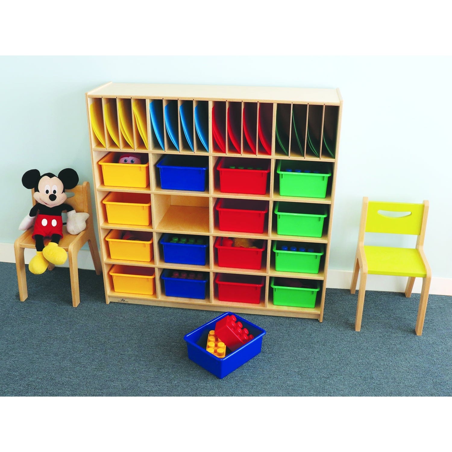 The ultimate classroom organizer! This versatile storage cabinet features 16 removable folder partitions (folders included) atop 16 assorted color-coordinated storage trays (included) that make classroom organization a snap.