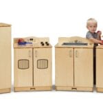 Provides realistic play with wooden turn-button controls, “ice-maker”, and four stove “burners”. Counter is 23.5″ high. Four piece set includes refrigerator, stove, sink, and cupboard.