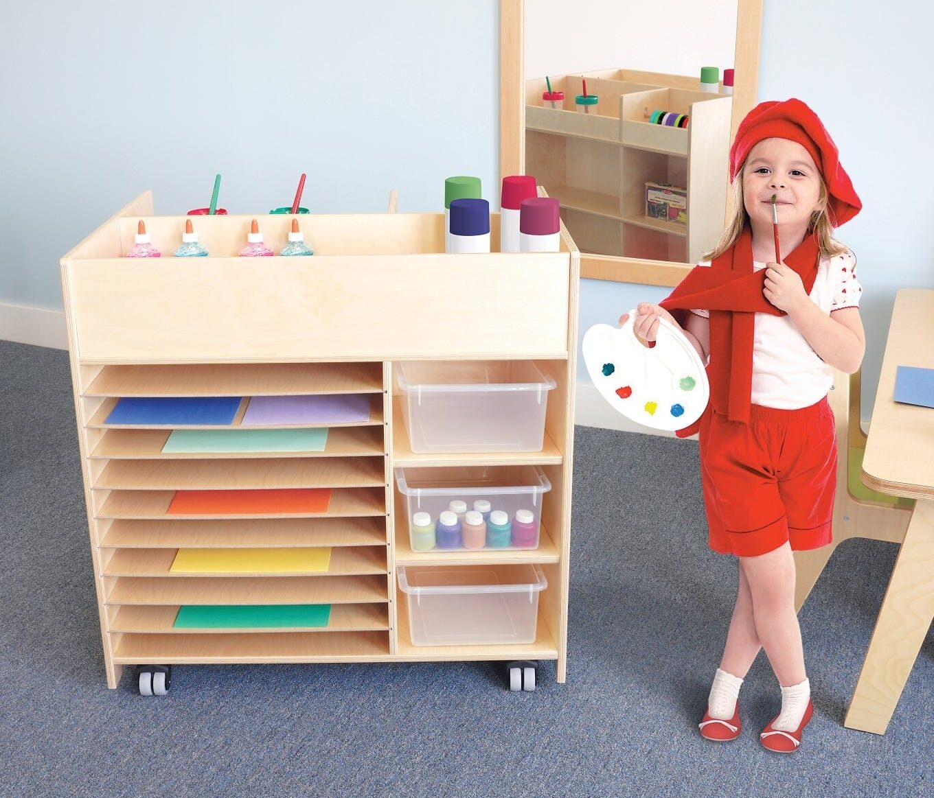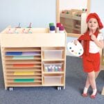 Organize art projects and materials in a snap! There’s plenty of thoughtfully designed storage compartments to organize your classroom art projects and materials, then roll the cart out of the way on heavy duty non-marking casters when not in use.