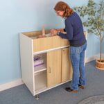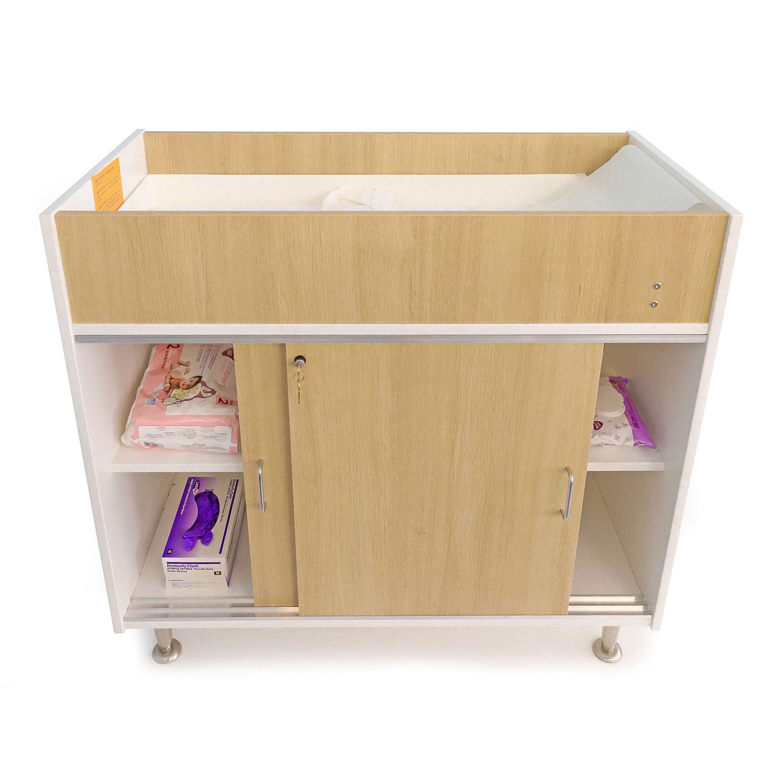 A fresh modern look for the nursery! This beautiful infant changing cabinet features contrasting white and textured white oak panels that form crisp, clean lines offset by brushed nickel legs with integrated pads to protect floors. The top is a 7-1/2″ deep changing well with a heavy duty tub insert that withstands rigorous cleaning and sanitizing after each use. Behind the lockable sliding doors are two fixed shelves that provide ample and secure storage for all your diapering supplies. Other important features Include a washable changing pad, safety strap, one paper roll, and an easy-tear cutter bar for fast and easy paper changes. Coordinates with all other pieces in the sophisticated chic and thoroughly modern elevatED™ Collection.