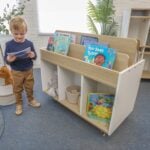 Mobile book storage with style! Beautiful contrasting white and textured white oak panels form crisp, clean lines that add refined style to this mobile book storage workhorse. Four open horizontal rows display books vertically atop three large compartments on each side that store hundreds of books, magazines or library supplies. Mounted on heavy duty non-marking lockable casters that enable one adult to move it easily around the room or school, even fully loaded. Coordinates with all other pieces in the sophisticated chic and thoroughly modern elevatED™ Collection. Ships partially assembled.