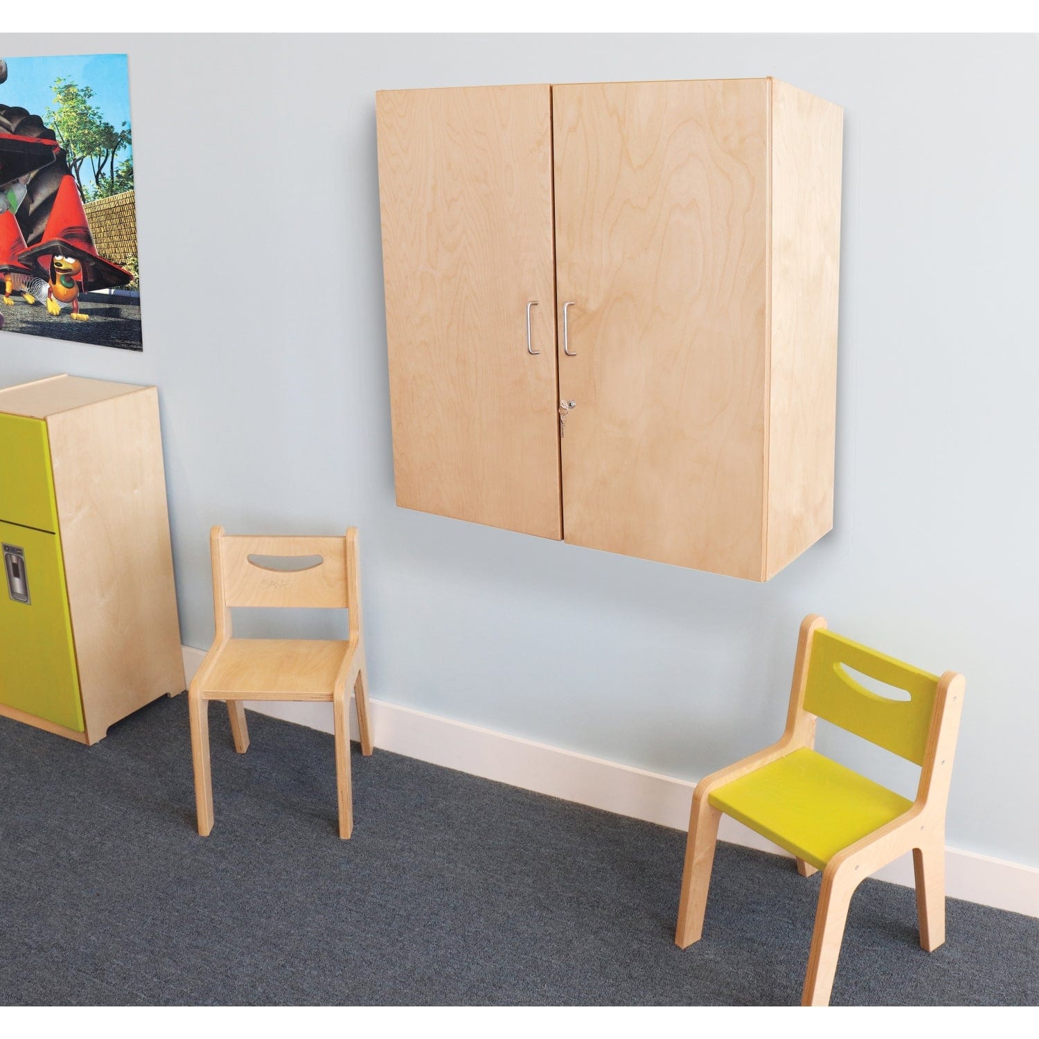 The doors feature satin nickel cabinet pulls and are exterior mounted on European soft-close hinges to prevent fingers from being pinched. Lock and keys included.