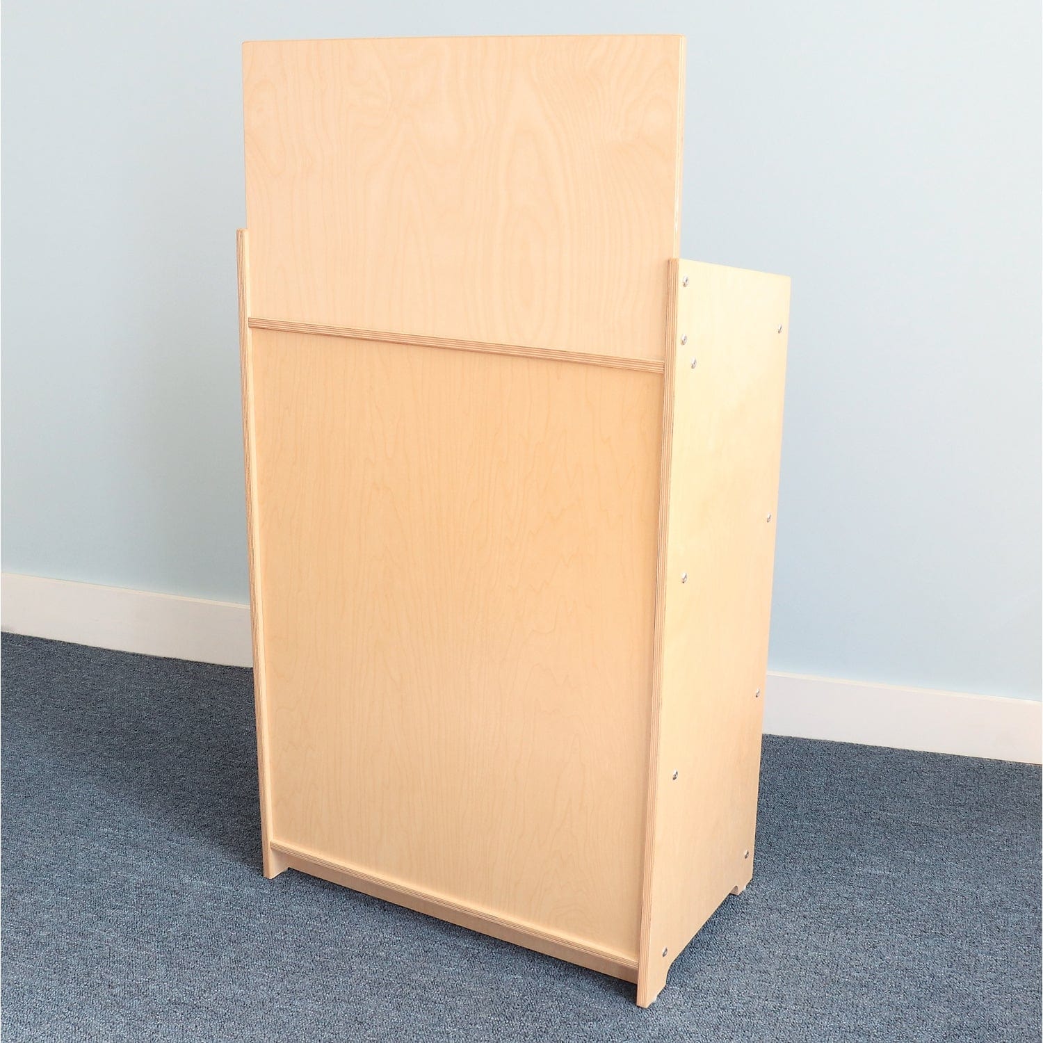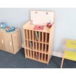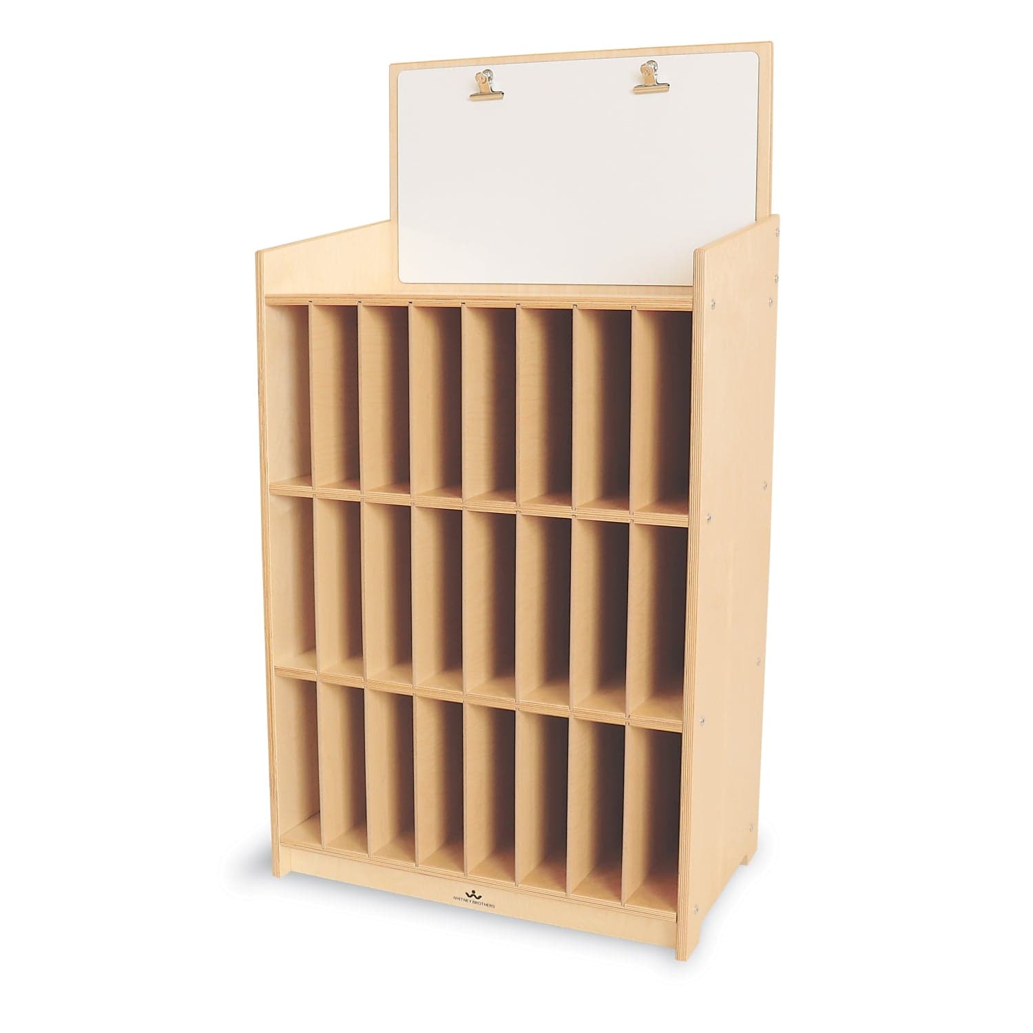 This cabinet features 24 mail slots for messages to parents and children and a fixed-position erasable marker board with two handy clips to post daily news and schedules.