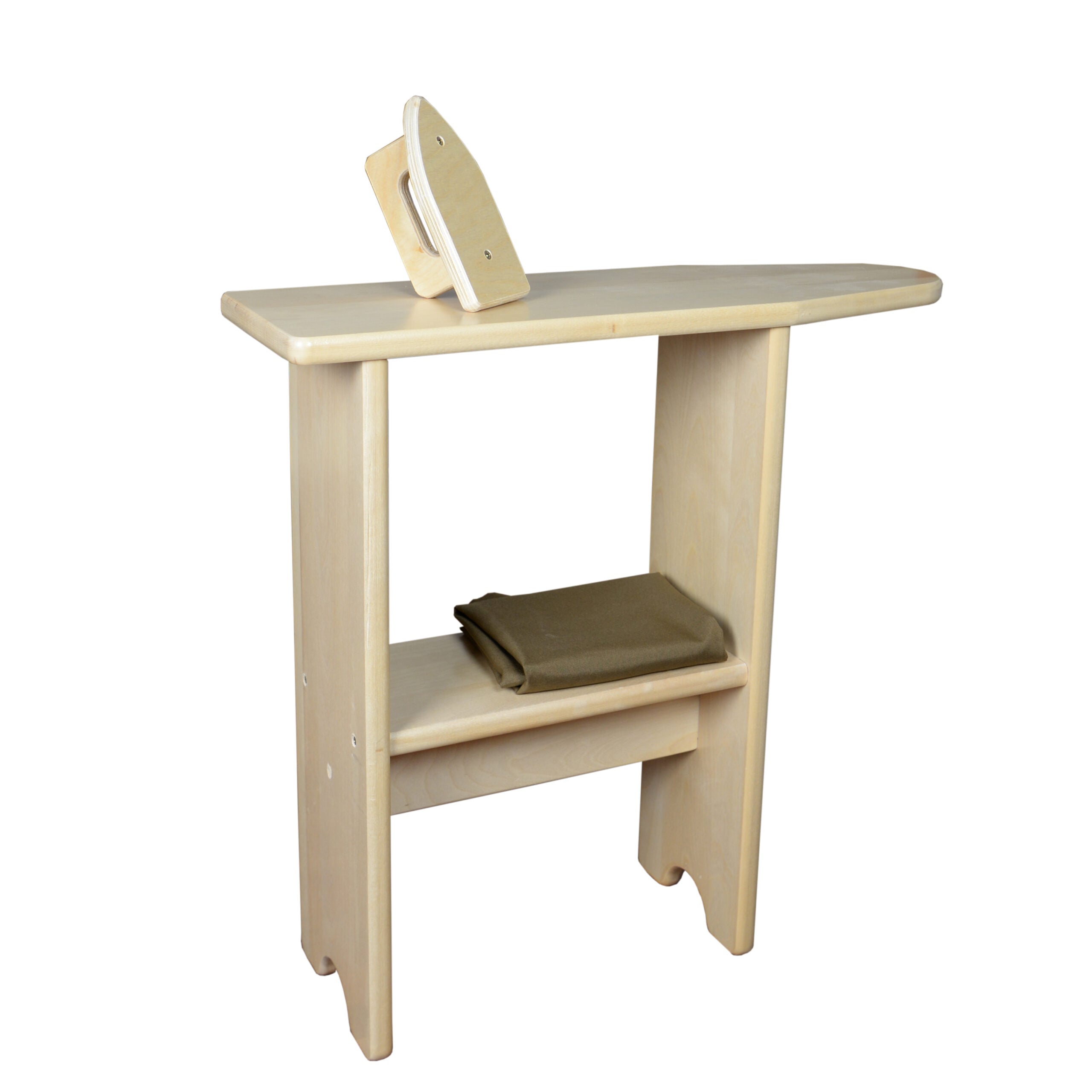 GREENGUARD Gold certified. Realistic ironing board with storage shelf is sturdy and practical. All wood iron and board.