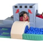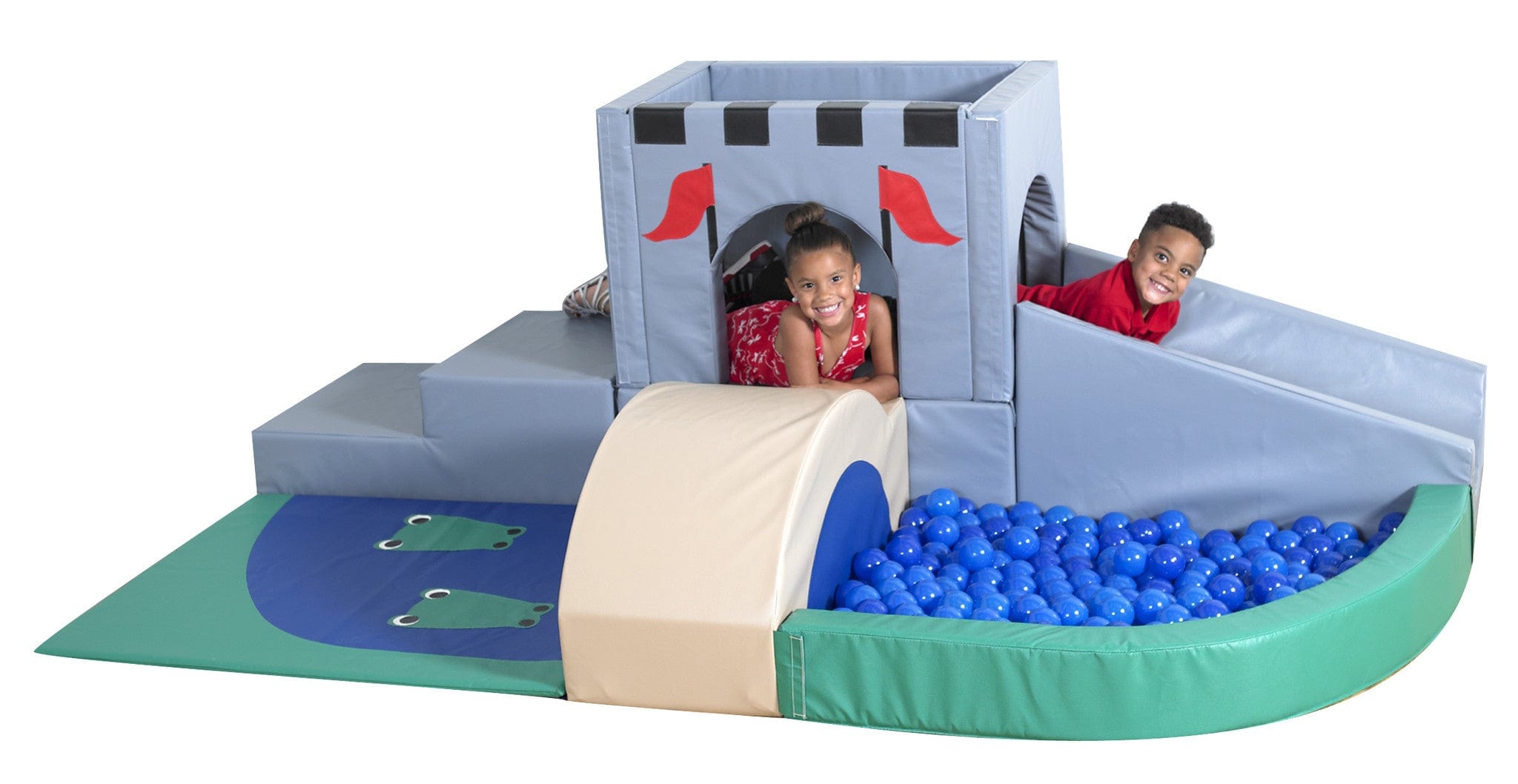 Little knights and damsels can explore and defend their castle! This colorful soft play set features a castle with a ball pit moat, gentle steps, bridge and ramp.