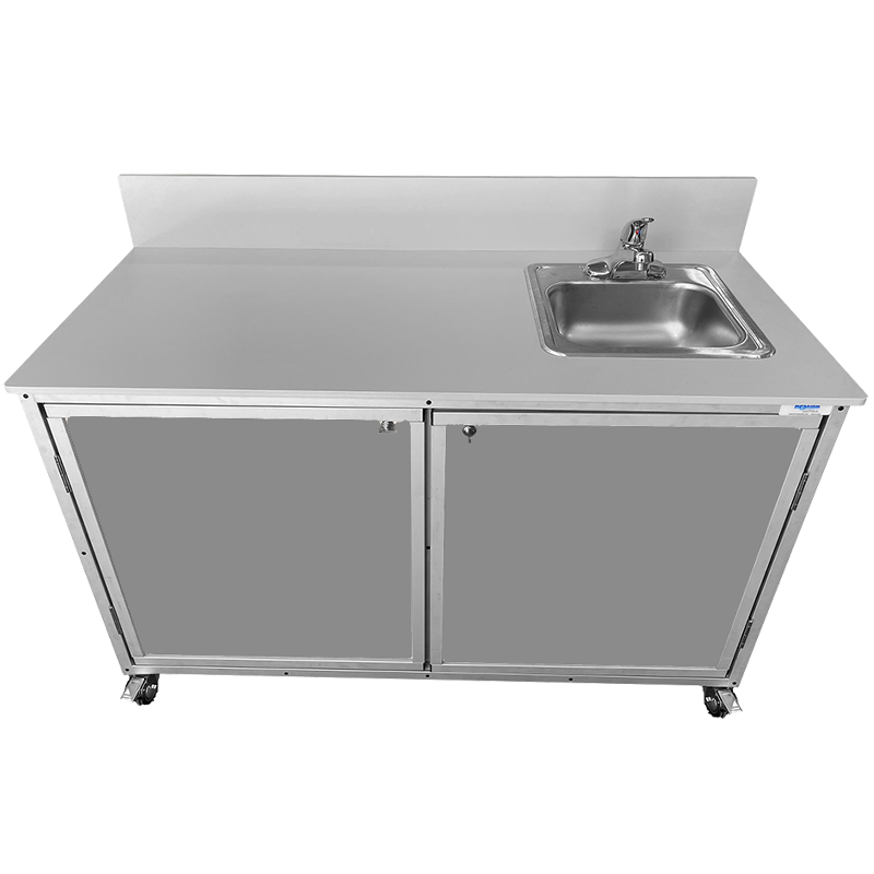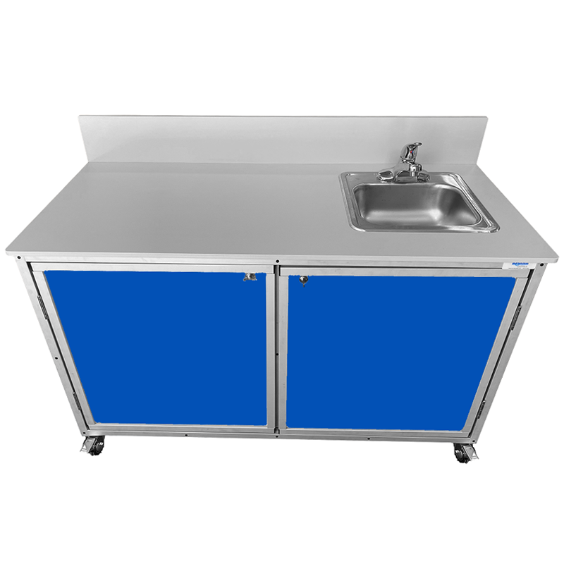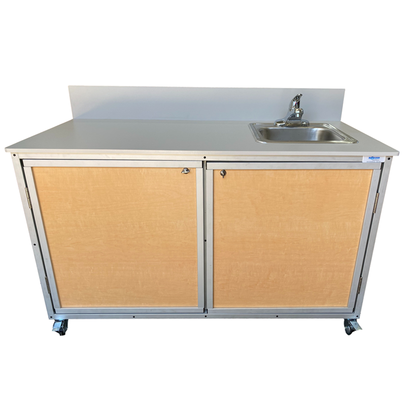 Monsam Workstation With Counter And Portable Sink PSE-2046 The Monsam PSE-2046 is a multifunctional workstation that combines a spacious demonstration counter with a built-in portable sink, making it an excellent choice for classrooms, science labs, cooking demonstrations, and training environments. With a large 51″W x 22.5″D surface area, this no-plumbing sink provides ample room for experiments or presentations while ensuring hot and cold running water is always within reach. This self-contained portable handwashing station includes a stainless steel basin measuring 11″W x 10″D x 5.5″H, connected to a 6-gallon fresh water tank and a 7-gallon waste water tank. An adjustable heater supplies water at 95°F to 140°F, and the entire system is powered by a standard 110V, 20-amp outlet. No external plumbing is required—simply fill the tanks, plug it in, and the unit is ready to use. Durably constructed with a lightweight aluminum frame and heavy-duty FDA-approved plastic panels, the PSE-2046 is built to handle busy learning and work environments. At 145 lbs., it is mobile and secure, equipped with swivel casters and locking brakes. Available in six cabinet colors, this workstation ships fully assembled and ready to enhance any educational or demonstration space. Features