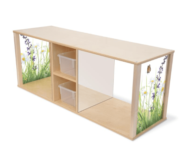 Encourage early mobility and exploration! Babies and young toddlers will enjoy crawling through the two large openings to explore their reflection on safe, shatter-resistant acrylic mirrors mounted on each interior side wall and the clear shatter-resistant acrylic end panels provide unobstructed views of the child inside for safe supervision. The middle compartment features two open fixed shelves and two clear plastic trays [included] that put toys, manipulatives or other items within easy sight and reach by early movers. The cabinet surface is just the right height to foster a young child’s confidence to go from crawling to standing and then take their first steps. Coordinates with all other furniture pieces in our award winning biophilia-inspired Nature View Collection. All corners and edges are rounded over and finished smooth for safety.