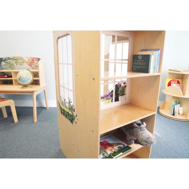 A cozy children’s window seat just like at home! The pretty potted plants and window box flowers seen through big, bright windows lend a cheery, comforting welcome to this cozy space that’s ideal for reading, reflection, or relaxing away from the busy classroom. The front is a roomy 12″H seat [green cushion included] with a spacious storage compartment underneath, flanked on the sides and back by shatter-resistant clear acrylic windows that dampen noise and provide important visibility of the child inside. In back are four fixed shelves that provide ample storage for books, toys, puzzles, games, or other classroom materials. Satisfies every state requirement for a designated quiet space in an Early Learning environment and coordinates with all other pieces in our award-winning biophilia inspired Nature View Collection [each piece sold separately]. All corners and edges are rounded over and finished smooth for safety.