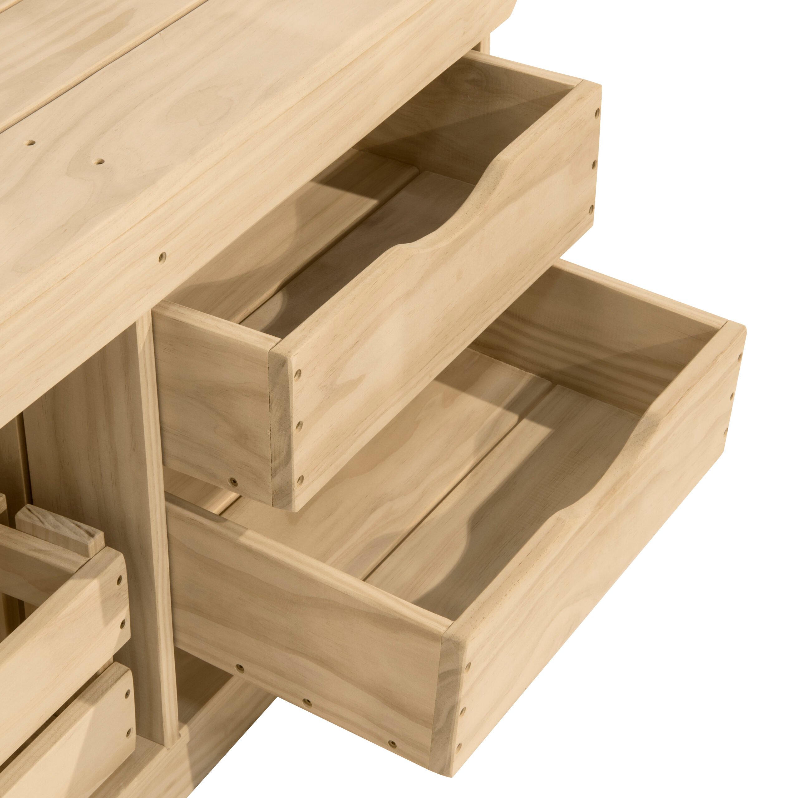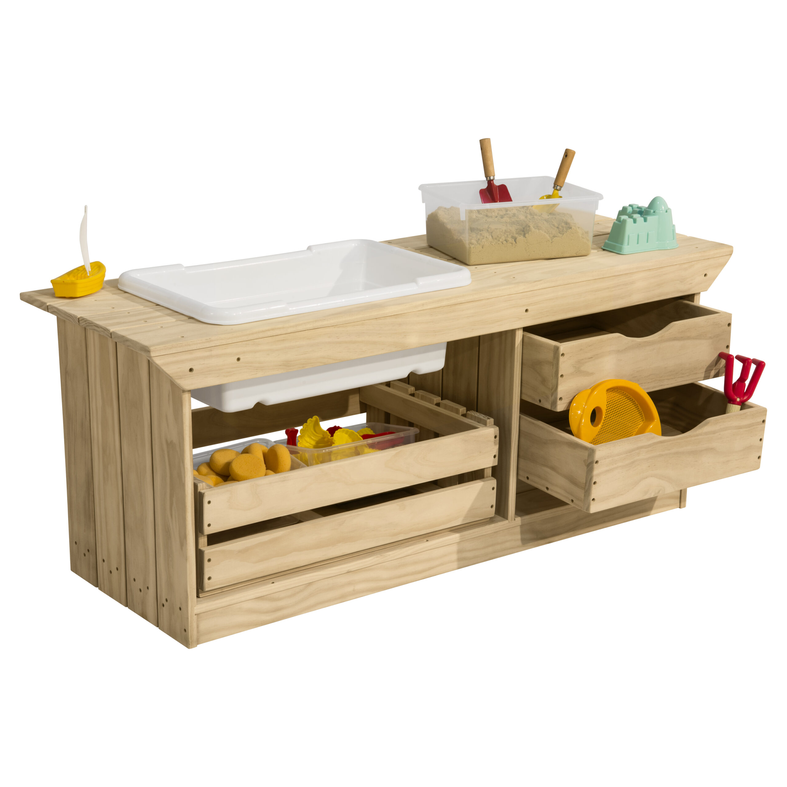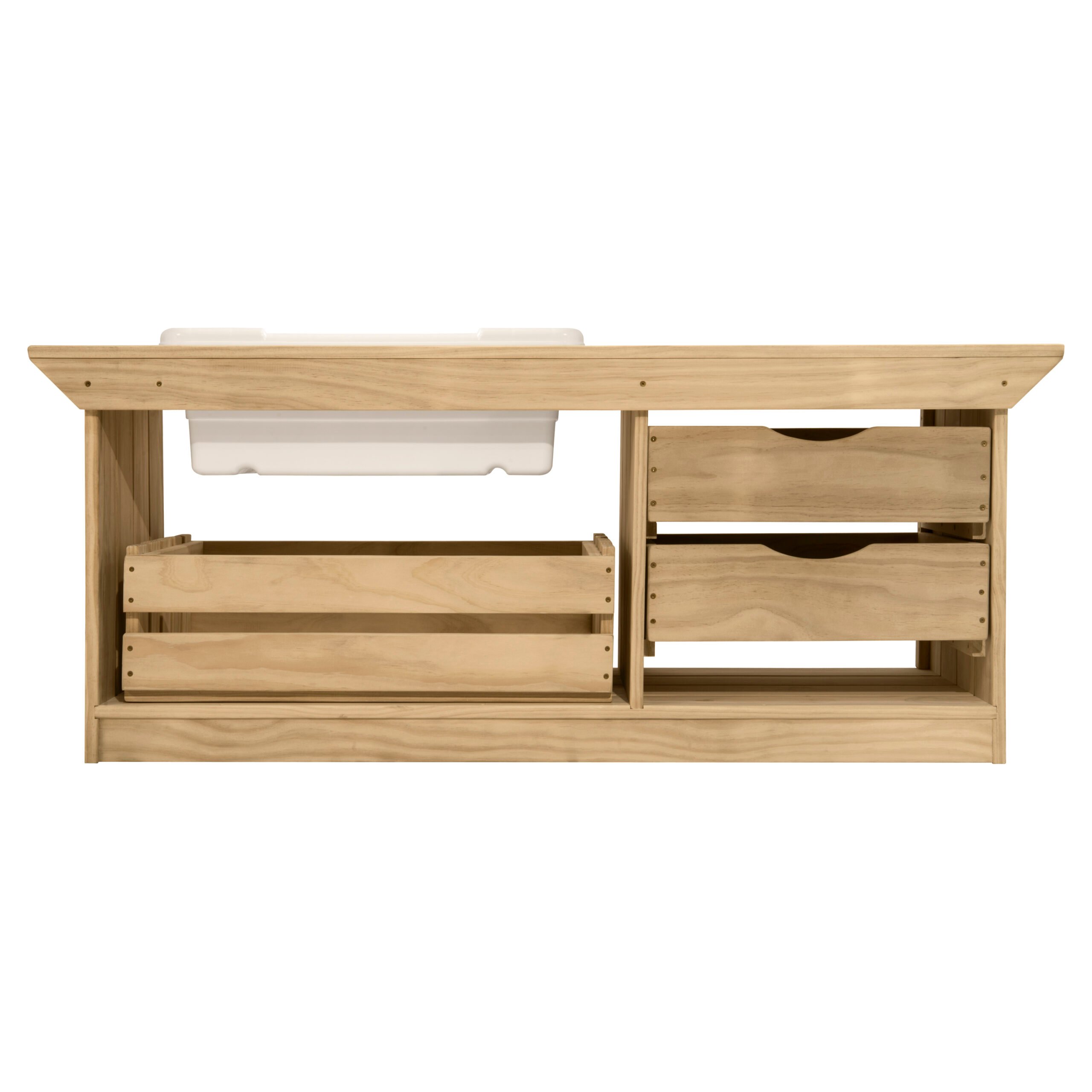 A kid-sized outdoor mud kitchen with a removable sink liner, storage crate, and sliding drawers, built from durable nontoxic acetylated wood with stainless steel hardware.