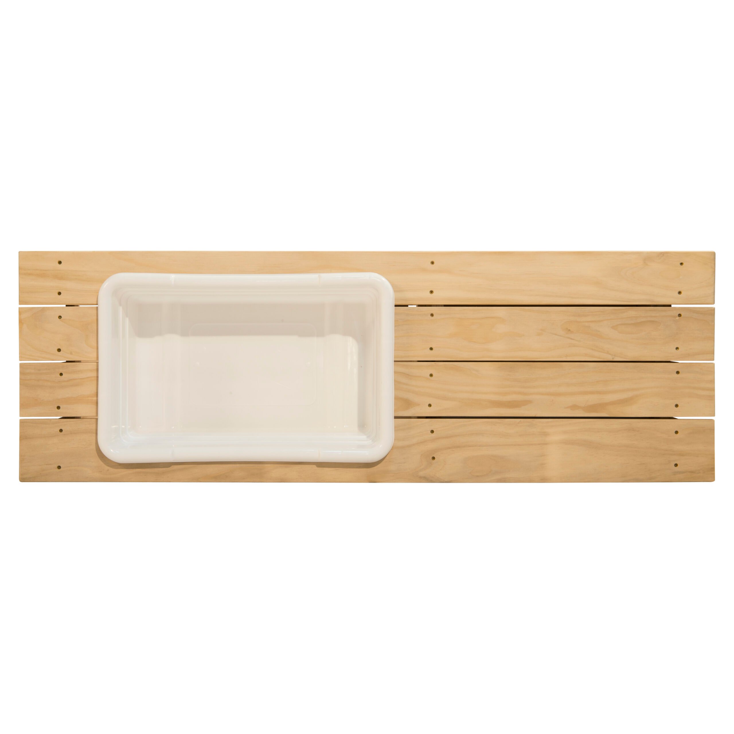 Have your children explore and play outside with the Wood Designs Mud Kitchen. This kid-sized outdoor activity station is ideal for fun and messy educational safe play! This kid-sized mud kitchen features a large removable white sink liner with ample space to get your hands dirty! Below there is a large weather safe removable crate to store and display all your backyard playthings. Additionally, two sliding and removable drawers to pull out for easy play and storage. The frame is constructed from durable and nontoxic acetylated wood. This type of wood defies the elements in any seasons from shrinking, warping and rotting. Edges and corners have been rounded for safety for any environment. Additionally, all hardware is stainless steel. Specifications