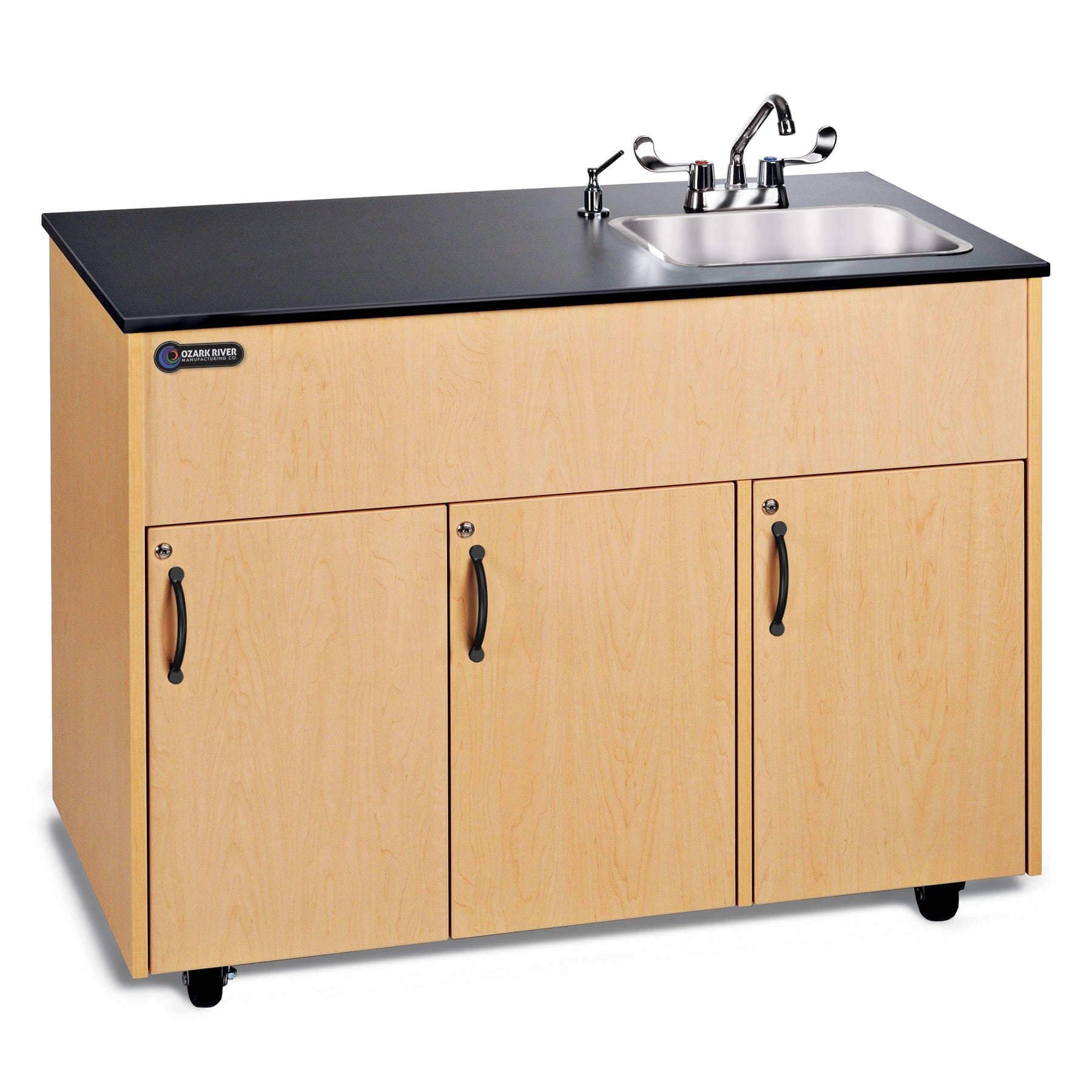 The Advantage 1D has a deep single stainless steel sink basin, a long countertop, and two keyless locking storage compartments, giving you plenty of extra workspace and practical storage to get things done. A third compartment houses the quick-connect fresh and waste water tanks, holding 45 to 60 hot water handwashings per fill. The durable laminate countertop stands up to high-volume use, making it the perfect solution for busy workspaces. Paired with the maple woodgrain laminate cabinet, this clean, fresh look delivers a stunning sanitation solution for a food service kitchen, backyard setup, classroom, science lab, or wherever a portable sink is needed.