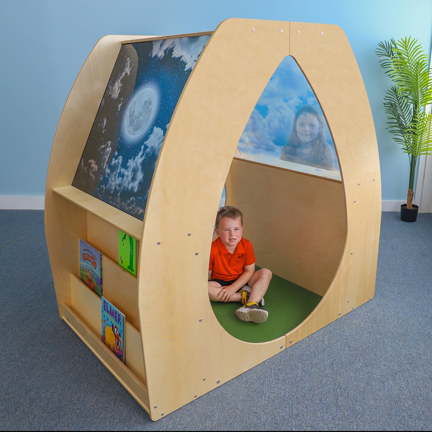 Award winner! The graceful curved openings invite children inside the cozy interior where the brilliant day and night skies create a calm, comforting personal space to relax, read, reflect or recharge away from the bustle of a busy classroom. The interior has built-in back rests, a floor pad and space for two children and one adult. The exterior has three cascading fixed shelves on one side and two adjustable shelves on the other for plenty of flexible book storage and display options. For safety, the wide openings and shatter-resistant transparent sky panels provide important visibility of children inside from all four sides. Scientific studies show that biophilic design can reduce stress, enhance creativity, focus clarity of thought and improve well-being, important health benefits that can lead to enhanced learning outcomes. The Sky View Sanctuary satisfies every state requirement for a dedicated quiet space in Early Learning environments and coordinates with all other pieces in our award-winning Nature View Collection, the world’s first biophilia-inspired furniture line for Early Learning.