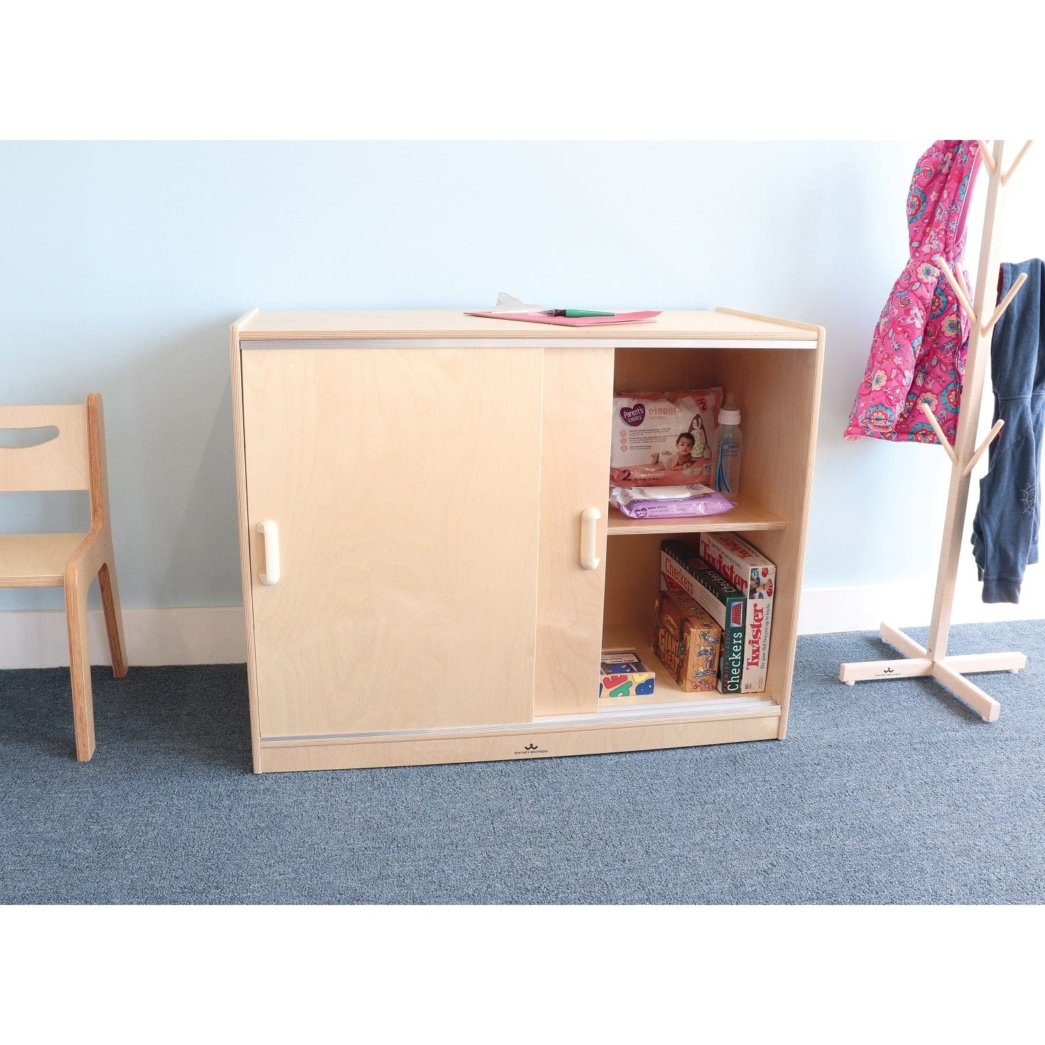 Avoid unsightly clutter! Stash away your supplies, books, toys or any other classroom materials behind the sliding doors of this handsome and functional storage cabinet. The deep fixed single interior shelf provides a generous upper storage compartment [17″D x 39.25″W x 13.75″H] and two roomy divided compartments below [each is 17″D x 19.25″W x 13.75″H]. Constructed in beautiful, durable birch plywood with no visible screws or joinery for a fine finished furniture look. Includes floor glides.