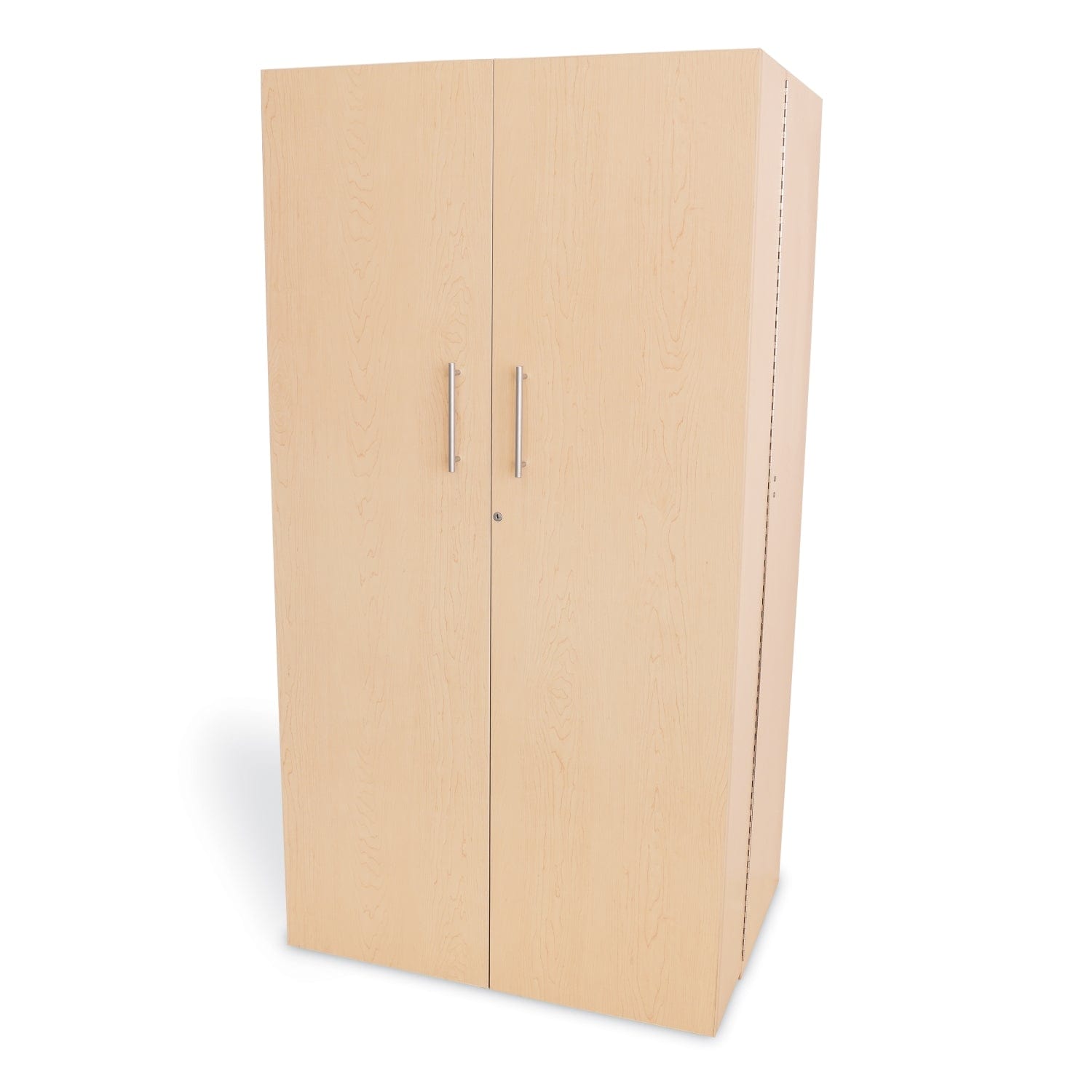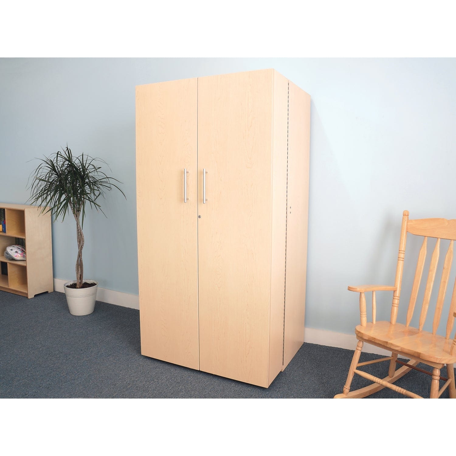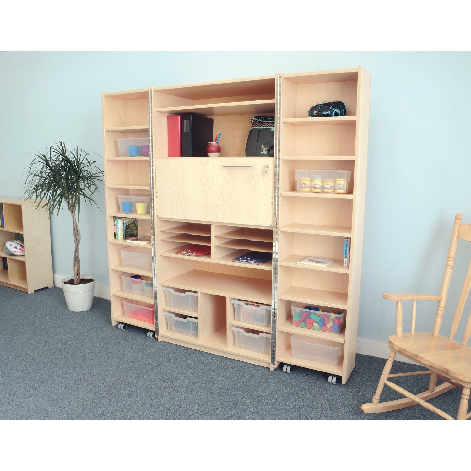 The main cabinet is stationary on floor glides and features a top section with one fixed shelf under one adjustable shelf, a middle section with a locking door mounted horizontally that opens 90-degrees to create a clever work surface that supports up to 100 lbs, and a bottom section that includes one fixed shelf below two columns of three adjustable shelves atop four cubby compartments with Gratnell trays [included] and an open center compartment. The two locking doors feature a total of eight adjustable shelves and eight fixed storage shelves with eight clear plastic trays [included], matte-finished steel cabinet pulls that match all other pieces in our Teachers Collection, and open on non-locking through-bolt casters and continuous piano hinges that prevent fingers from getting pinched.