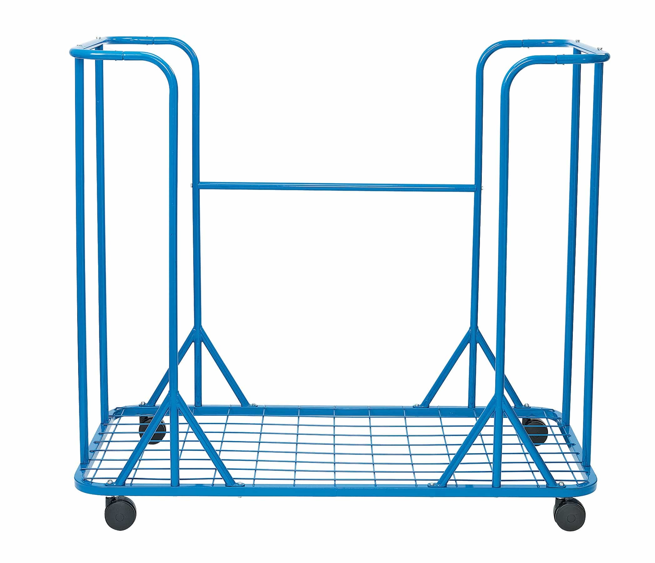 A universal rest mat cart that stores up to 40 rest mats, with powder-coated steel construction and four rubber casters including two locking wheels.