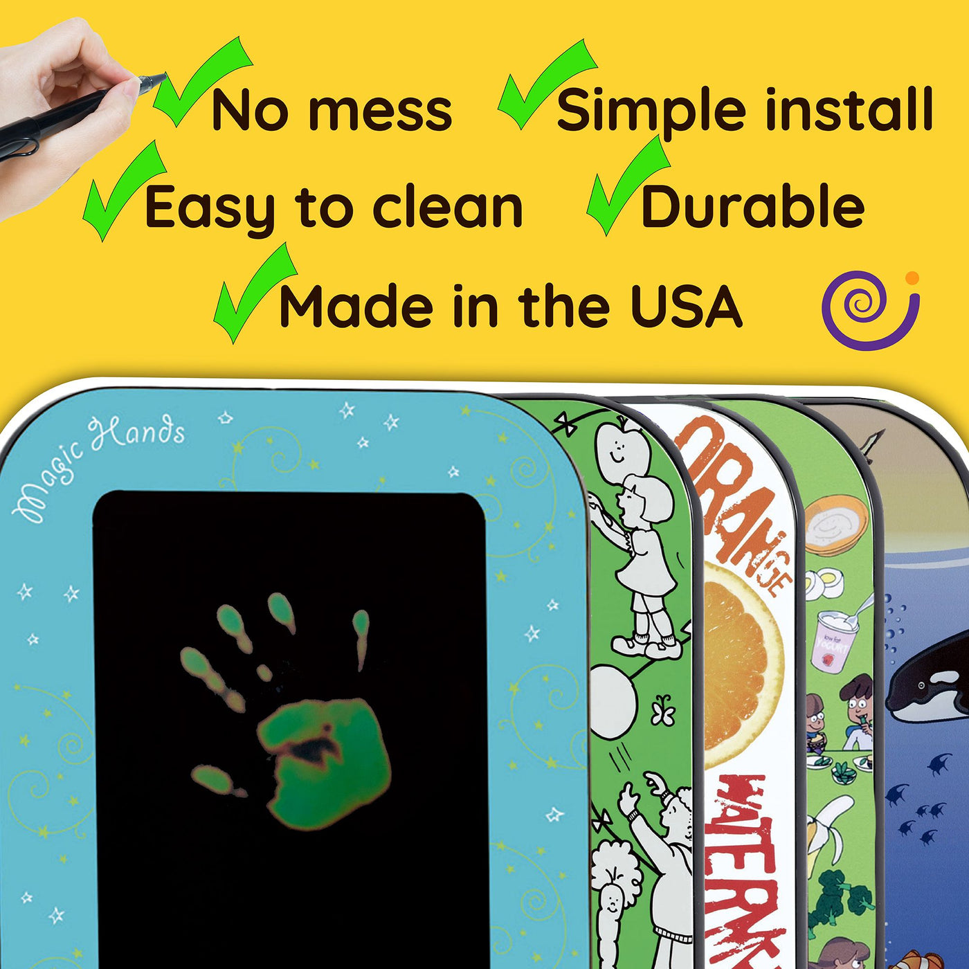 Children are naturally curious about the world around them. They'll enjoy exploring reflections of objects, themselves and others. Warm hands create bright, glowing colors, then the image fades until the next warm touch. Select from several popular designs. Easy to clean and terrific for pediatrics. The heat sensitive panel responds to the warmth of your hand and changes color! Perfect for waiting areas, early leaning enters and classrooms. For best performance the ideal room temperature for the play panel is between 68 and 73 degrees. Five year warranty. Mounting hardware is included.